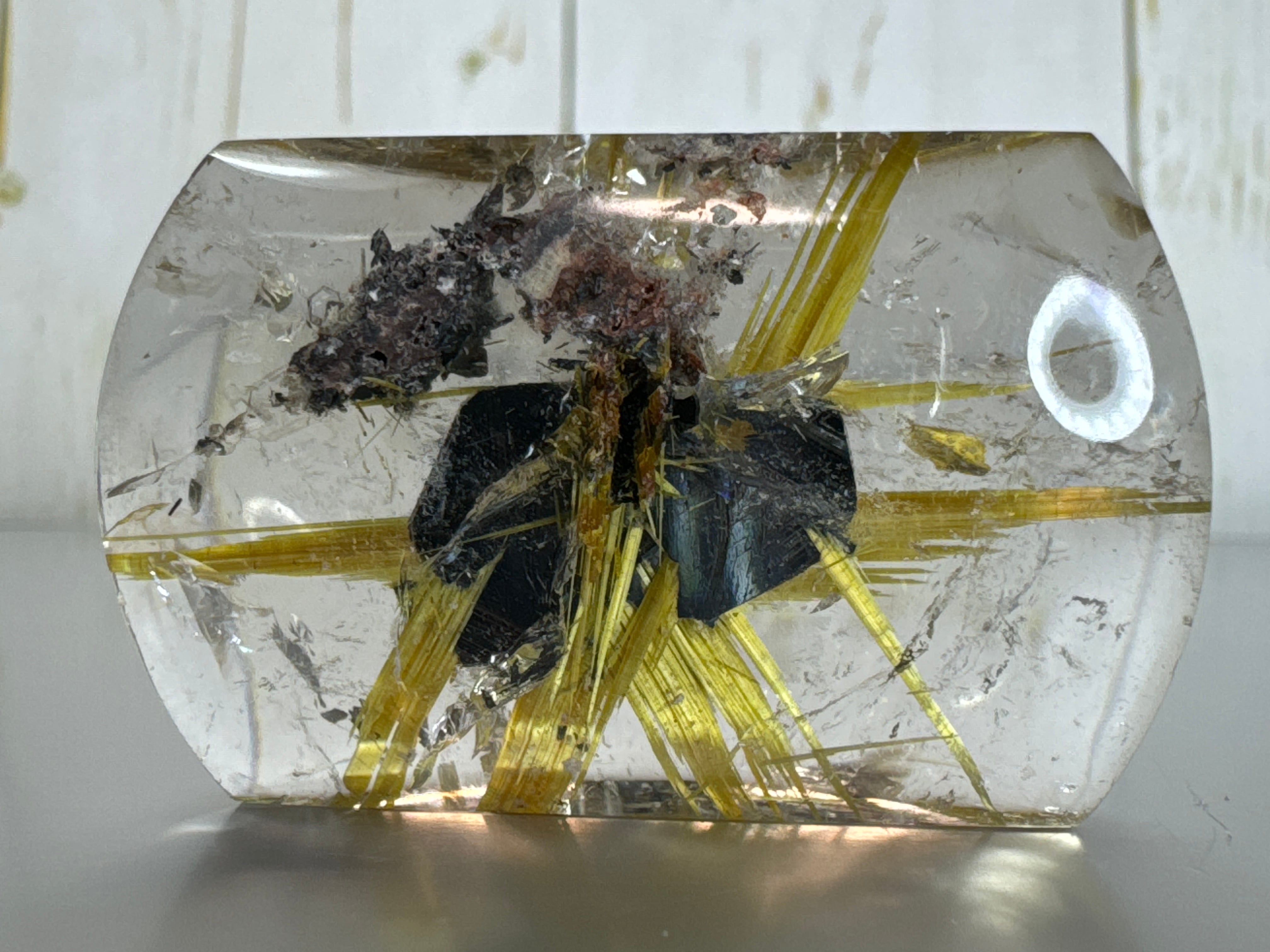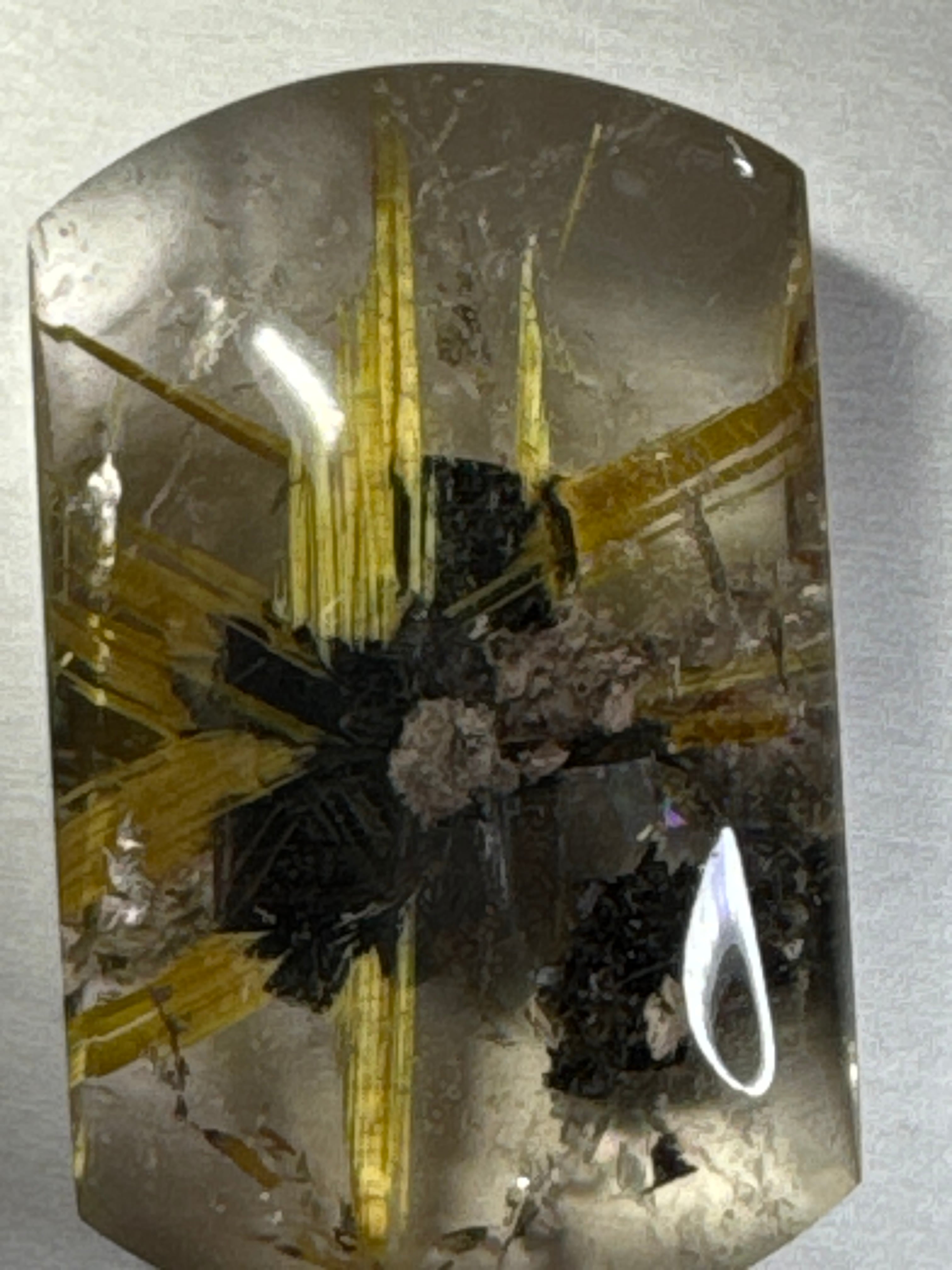 このタンブルはご覧の通り、夜の瞳と言われるヘマタイトから勢いよく八方に金針が伸びています。